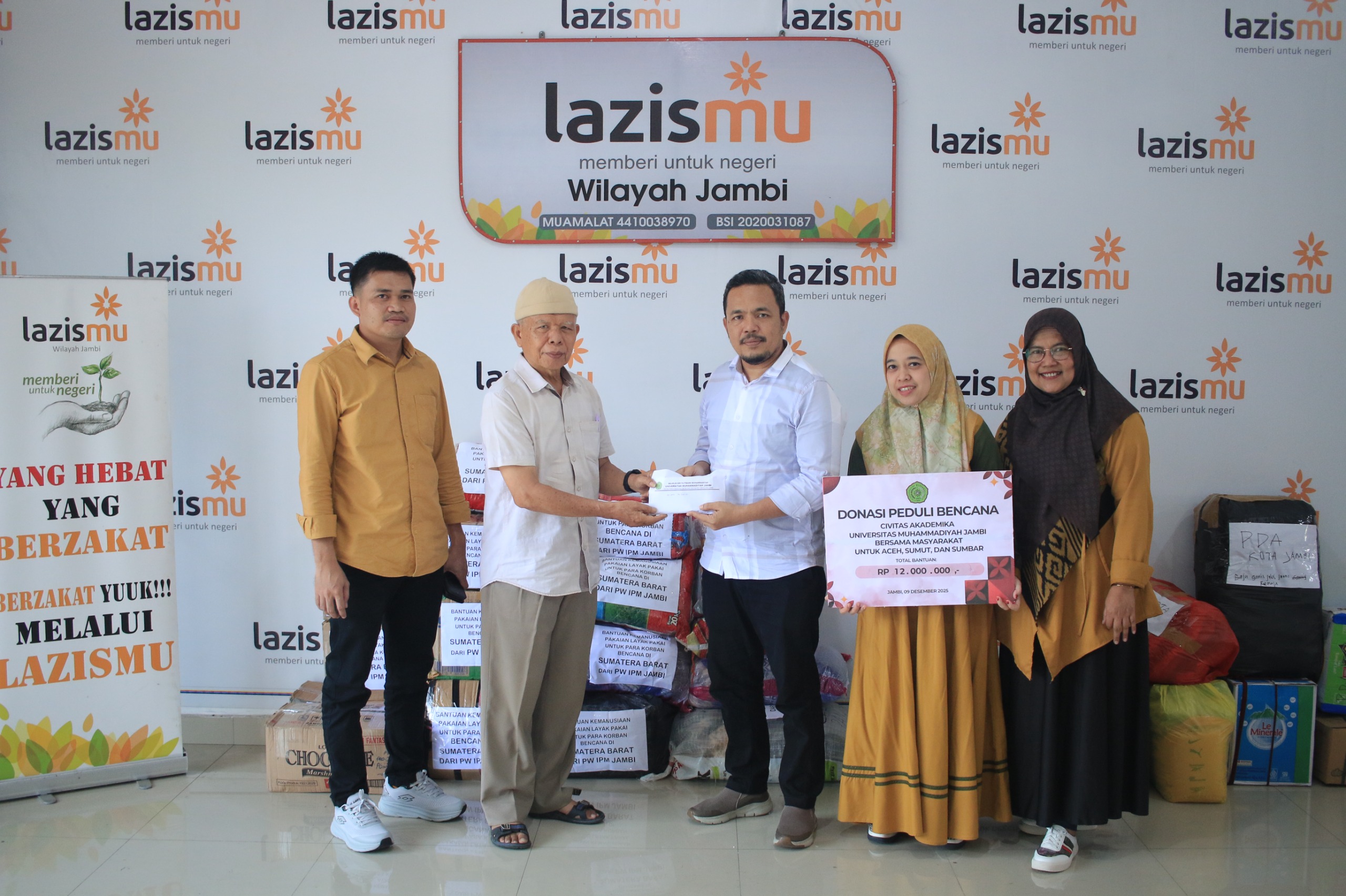 UM Jambi – Universitas Muhammadiyah Jambi serahkan bantuan bagi korban bencana alam di wilayah Sumatera melalui LazisMu Wilayah Jambi pada Selasa, (09/12) bertempat di Kantor LazisMu Wilayah Jambi. Bantuan diserahkan secara langsung oleh Rektor, Wakil Rektor I, Wakil Rektor II, dan Kepala Biro Keuangan UM Jambi kepada Bapak Ir. Zulyaden Murad selaku Wakil Sekretaris LazisMu Wilayah Jambi. Upaya ini merupakan wujud empati dan tanggung jawab sosial seluruh civitas akademika UM Jambi terhadap saudara-saudara kita yang terdampak musibah.
